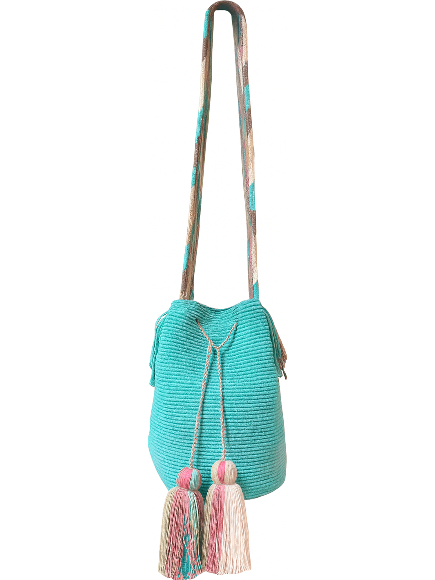 Handcrafted mochila woven by Wayuu women of La Guajira. Soft cream tones meet serene aquamarine accents in a design inspired by blooming desert waters. A refined expression of heritage, intention, and conscious luxury.
