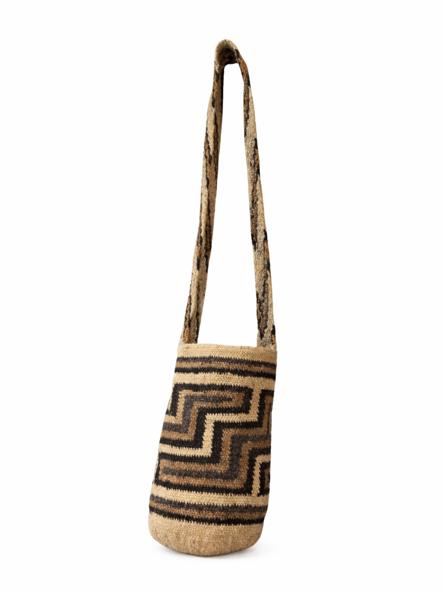 Earth Loom is a distinctive mochila handcrafted from a blend of sheep wool and alpaca fiber by an artisan of the Arhuaca Indigenous community, nestled in the sacred Sierra Nevada de Santa Marta, Colombia.