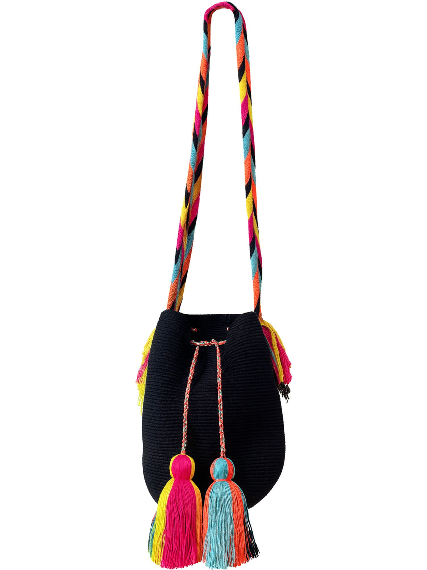 A powerful Wayuu mochila woven in deep black with vibrant aurora-inspired accents. A bold interplay of color, movement, and cultural artistry. Created to illuminate the night with heritage and emotion.