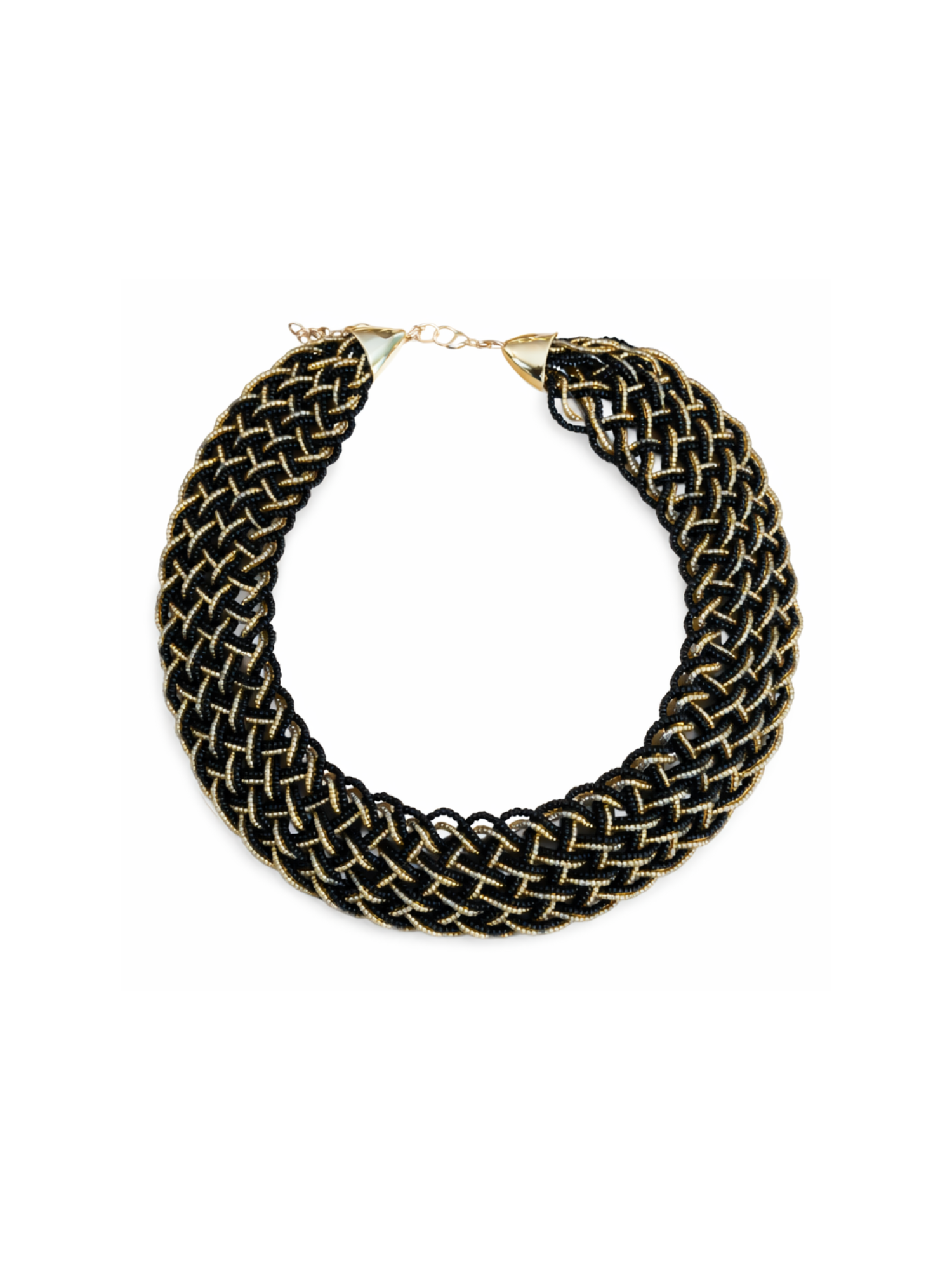 Over many days of detailed work, each bead is carefully interlaced to form a powerful, sculptural piece rooted in ancestral knowledge and contemporary elegance. The deep obsidian-black base evokes strength, mystery, and depth, while luminous gold accents flow through the design like threads of light—creating a subtle yet commanding contrast that recalls glowing embers against a dark night sky.